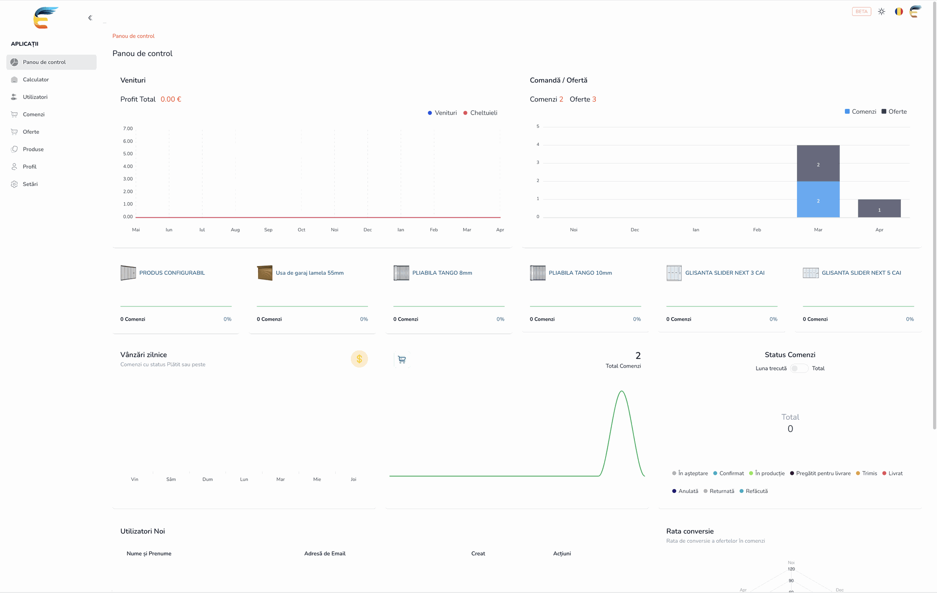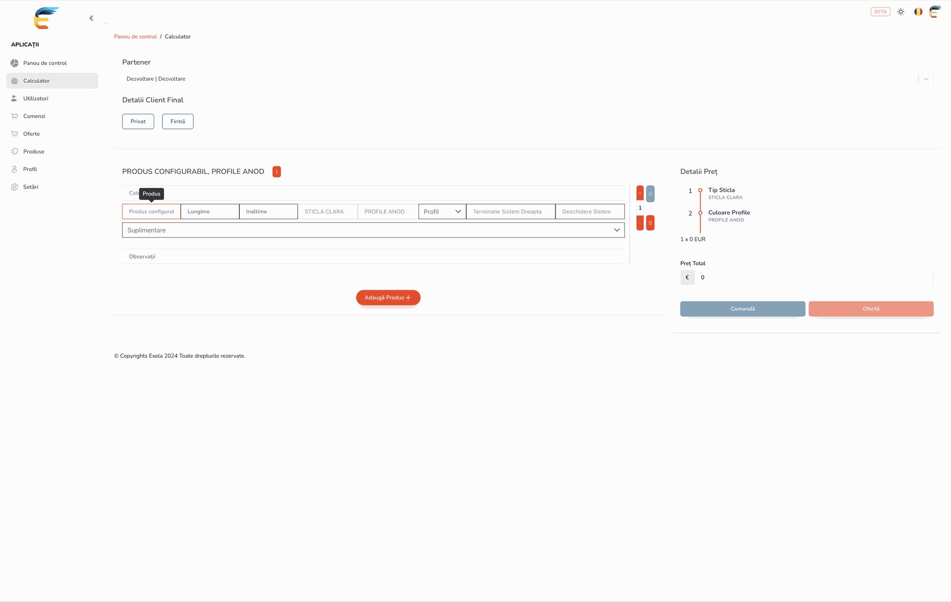 După confirmarea contului de către un administrator, clientul se poate autentifica în platforma și poate avea acces la configuratoarele de prețuri.